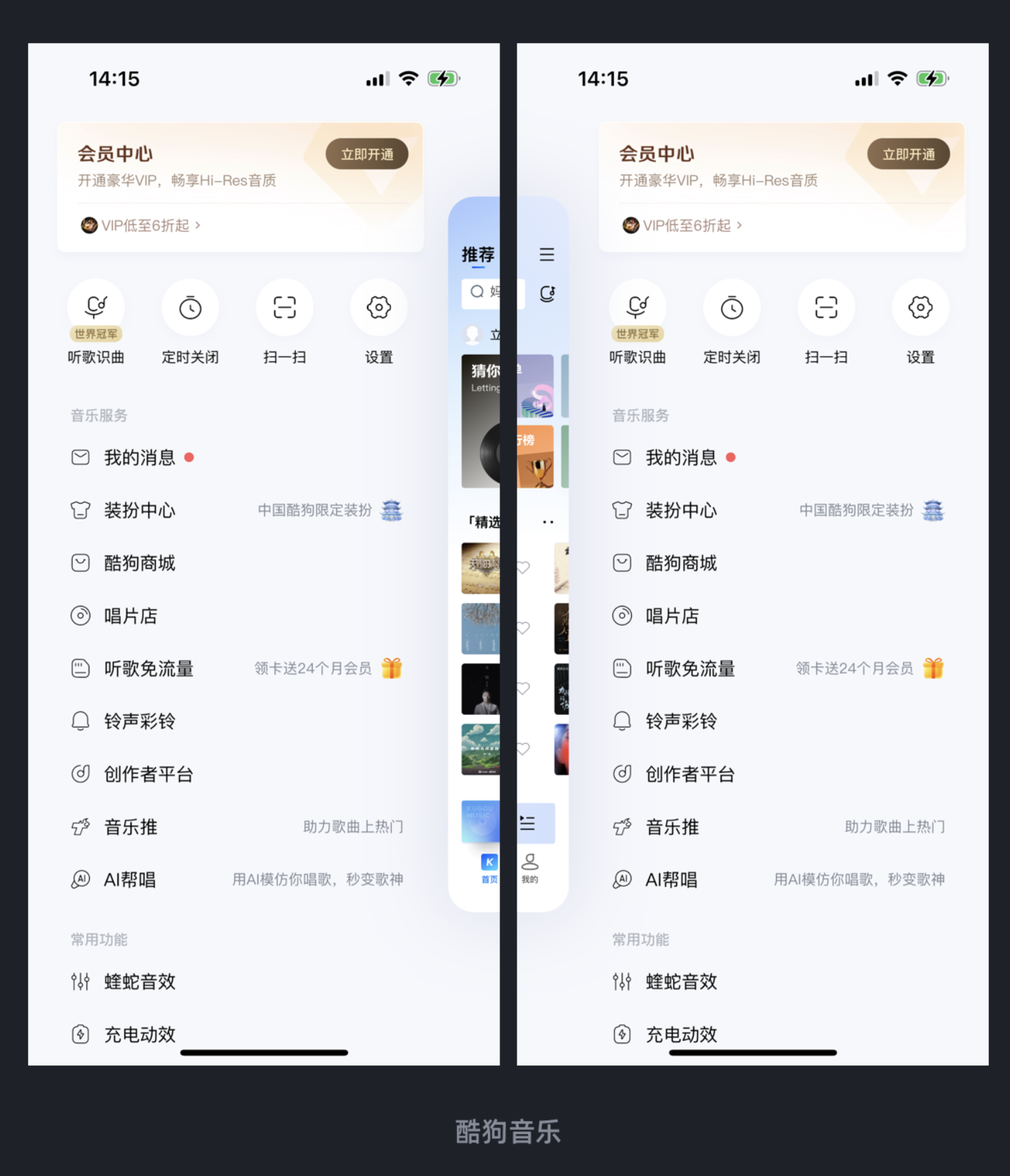 好的導航設(shè)計會兼顧不同用戶的操作習慣。酷狗音樂將底部標簽欄與抽屜式導航結(jié)合,高頻功能直接展示,低頻功能集中收納。考慮到大屏手機用戶的單手操作需求,它既支持點擊右上角圖標從右側(cè)打開導航,也允許左手貼邊右滑從左側(cè)開啟,完美適配左右手習慣的用戶。