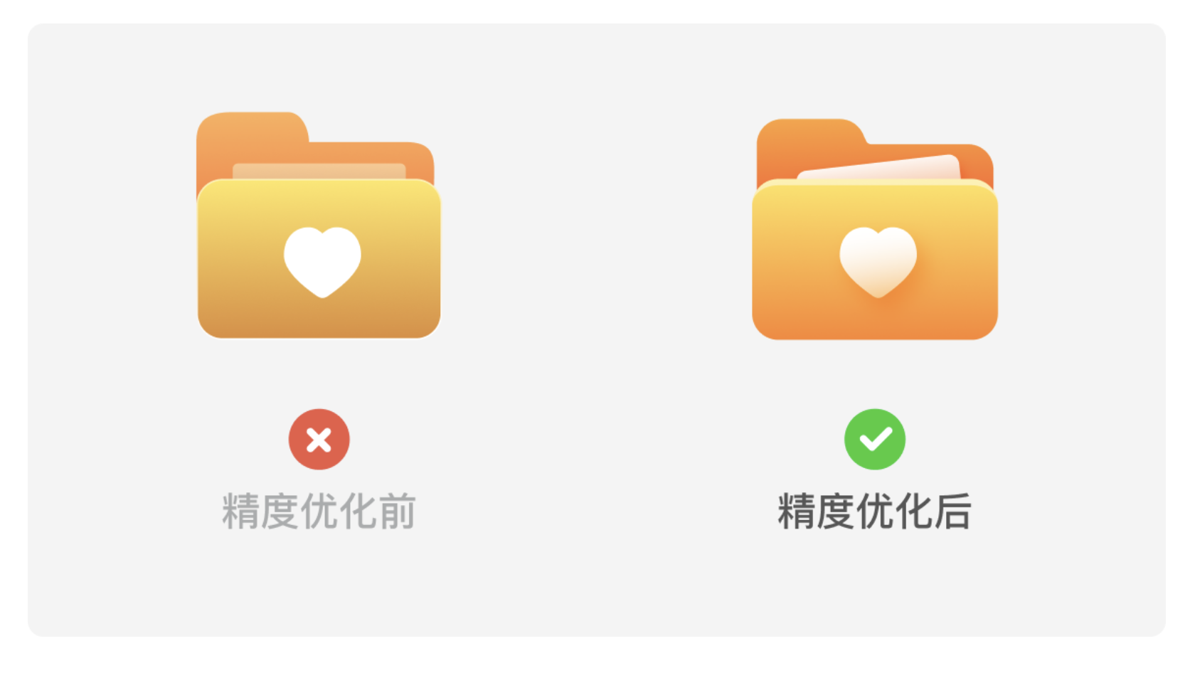 很多設(shè)計(jì)師認(rèn)為圖標(biāo)只要造型準(zhǔn)確就夠了,但恰恰是這些 “不起眼” 的小元素,最能暴露設(shè)計(jì)功底。以常見的文件夾圖標(biāo)為例,從 “能用” 到 “精致”,只需要 4 個(gè)關(guān)鍵調(diào)整: