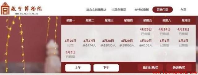 熱門(mén)景區(qū)門(mén)票售罄。記者4月23日登陸故宮網(wǎng)站發(fā)現(xiàn),“五一”假期前三天(5月1日至5月3日)的故宮門(mén)票已經(jīng)售罄。